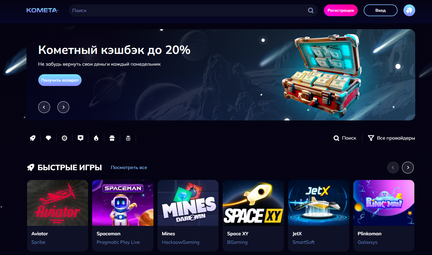 Kometa Casino — это новейшее лицензионное онлайн-казино, стартовавшее в 2024 году. Здесь собраны игры от ведущих разработчиков, таких как Amatic, BGaming, Yggdrasil, Play’n GO, Pragmatic Play, Thunderkick, Novomatic и других.